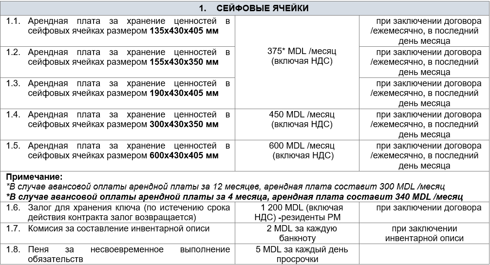 Тарифы сейфовых ячейках варьирует в зависимости от размера ячейки, с которыми можно ознакомиться в таблице ниже: